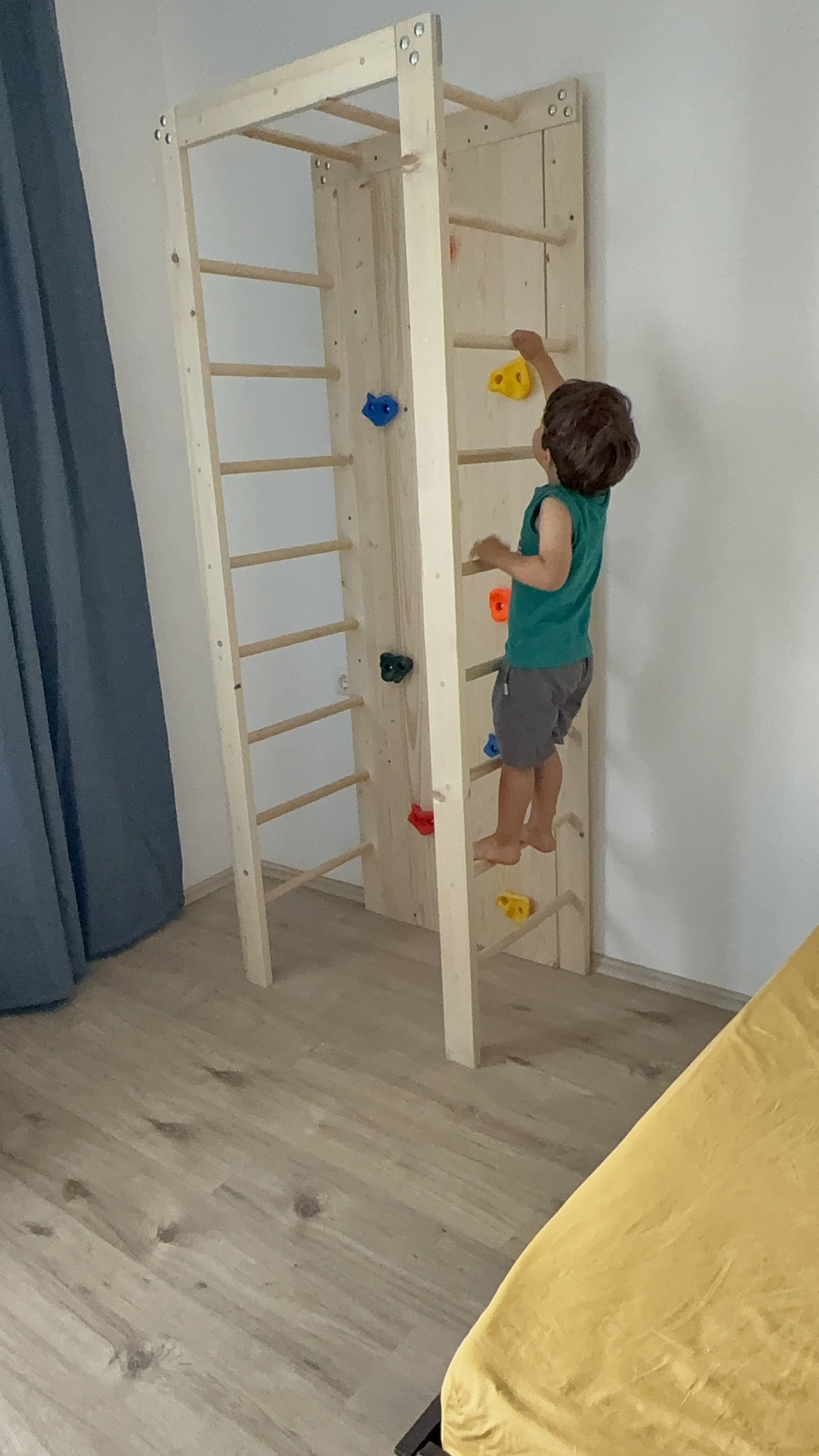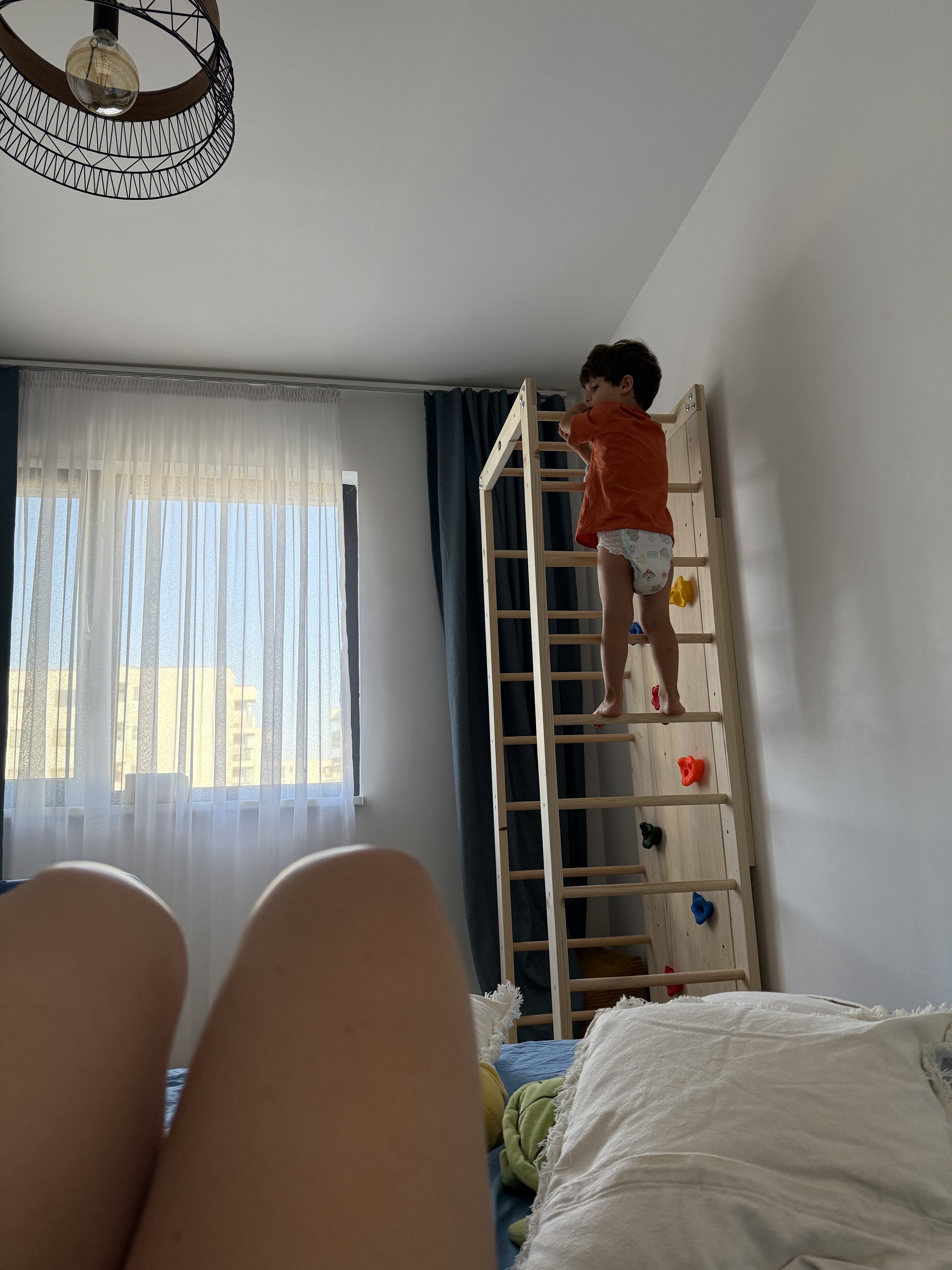 Si pentru ca este usor sa il lasi sa se miste cand e cald si stati mult afara, eu am gasit o solutie si pentru zilele friguroase si scurte ale iernii printr-un ansamblu de catarare facut de Mama si lemnul, adaptat percet pe dimensiunile unei camere de apartament. Colaborarea cu ei a fost minunata si daca sunteti in pana de idei aceasta este una cu adevarat folositoare. Pentru mine este de ajutor si a-l antrena mai usor in exercitiile de kinetoterapie pt tal vag ce le facea inainte cu kinetoterapeutului si pa care eu trebuie sa le continui acasa.